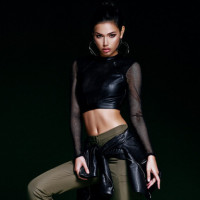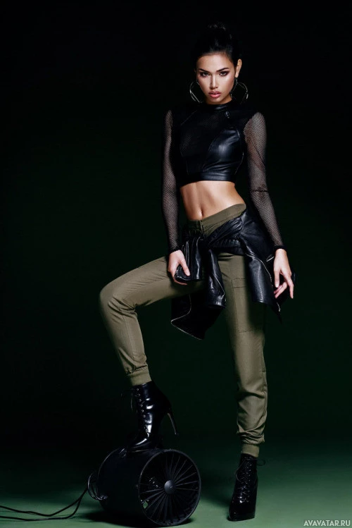 a black top that has some mesh detailing and high-waisted trousers that appear to be olive green or grey. Her right arm is crossed over her body, and she is wearing