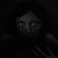 The image shows a young woman who appears to be in a state of surprise or shock. She has wide, open eyes and her mouth is slightly agape, which suggests that she might have just seen something unexpected. The surrounding darkness adds to the eerie atmosphere of the photo.