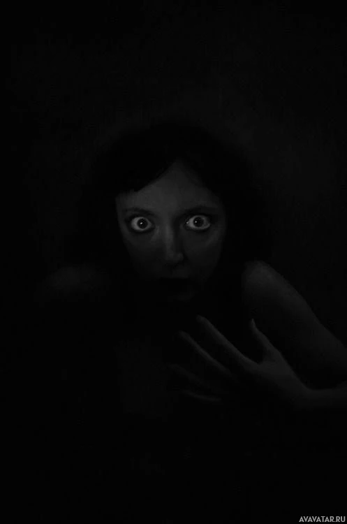 На снимке изображена молодая женщина, которая находится в состоянии удивления или шока. У нее широкие, открытые глаза и рот слегка агапе, что говорит о том, что она могла просто увидеть что-то неожиданное. Окружающая темнота добавляет жуткой атмосфере фотографии.
