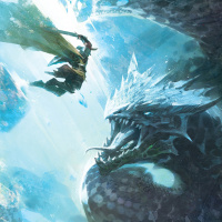 mythical beast, as they wield a sword that is piercing through the creature's body. Both characters are in