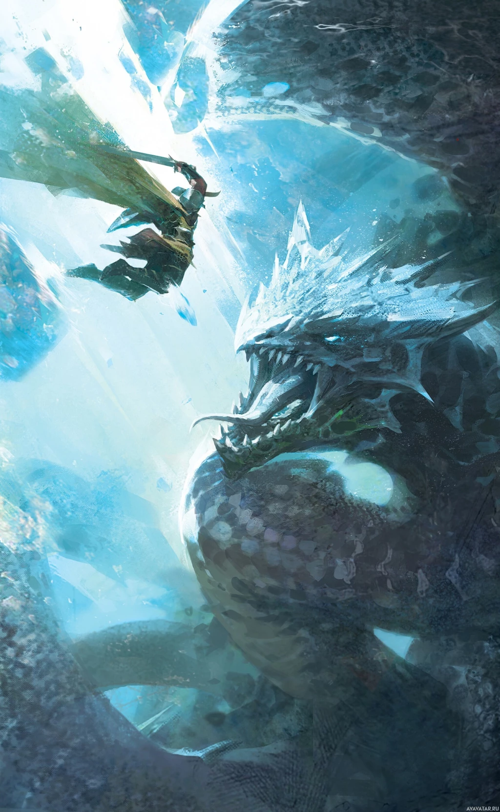 a fantasy scene featuring a warrior and a monster. The warrior appears to be on the back of a large creature, possibly a dragon or another