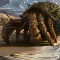 a fantastical scene with a large, anthropomorphic crab on the beach. This creature appears to have humanoid features such as eyes and arms that resemble those of a human, which is characteristic of fantasy artwork. The setting looks like a tropical or coastal environment, typical of