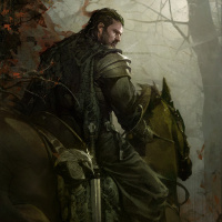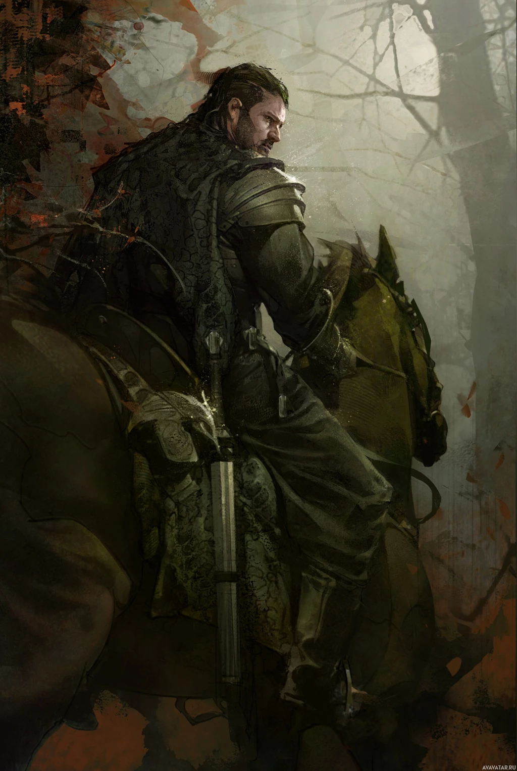 a forest setting, possibly during dusk or twilight given the soft lighting. The rider is wearing armor and is seated atop the horse, which is adorned with decorative elements that might suggest a historical or fantasy context. Behind the rider, there's a misty background that adds to