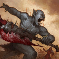The image depicts a fantasy-themed illustration with dark and ominous tones. At the center of the scene, there is an enraged figure that appears to be a monster or demon, wielding