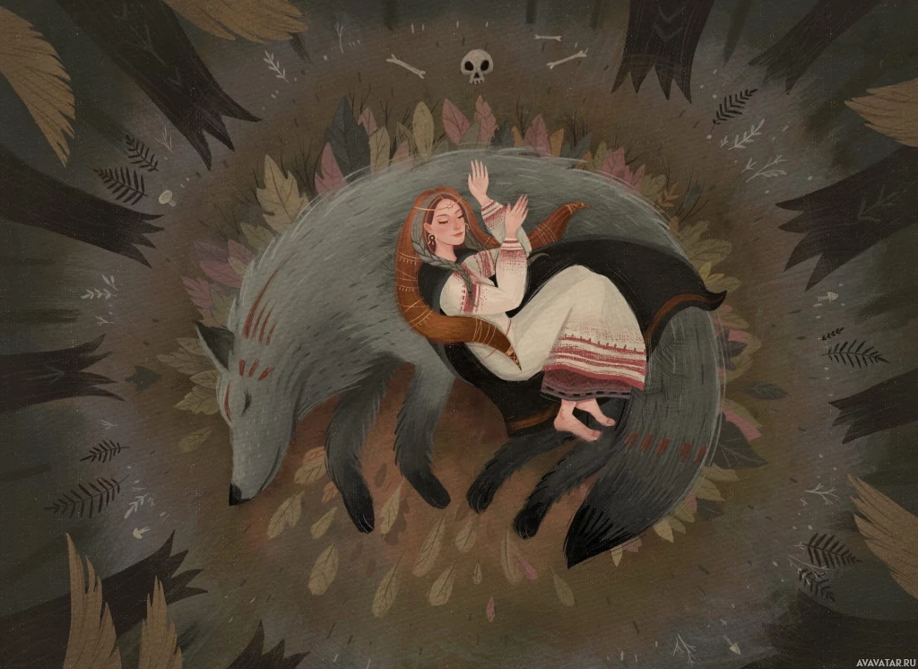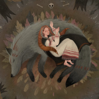 In the picture, there is a girl lying down with her arms stretched out towards what appears to be a wolf. The setting seems to be in a forest or woodland area, with trees and leaves around them. The style of the image suggests it might be an illustration with a dreamlike quality, possibly representing a scene from a fantasy story or