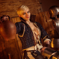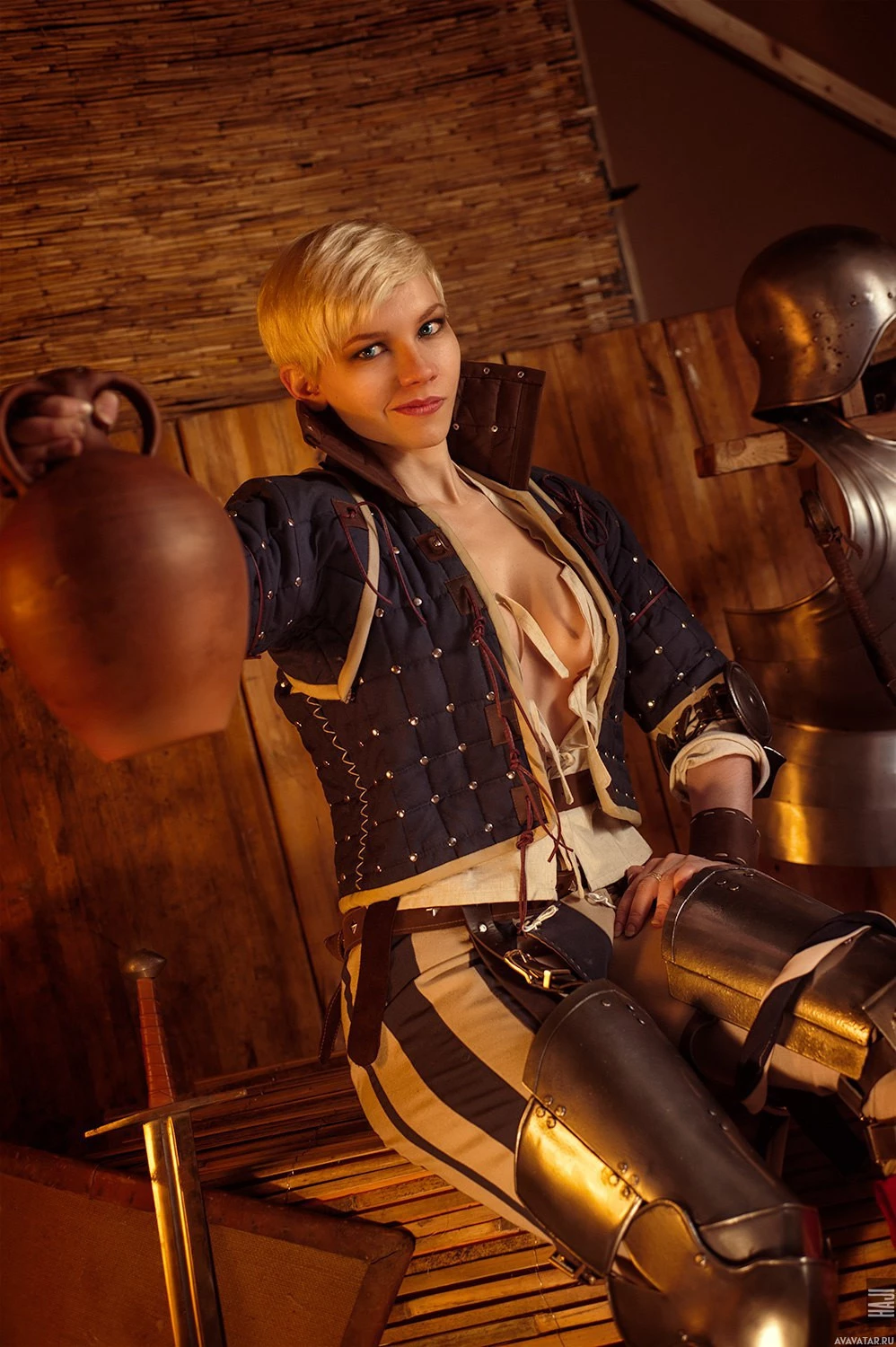 The image shows a person dressed in costume, specifically resembling the character Ves from "The Witcher 3: Wild Hunt," a popular action role-playing