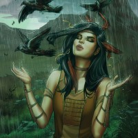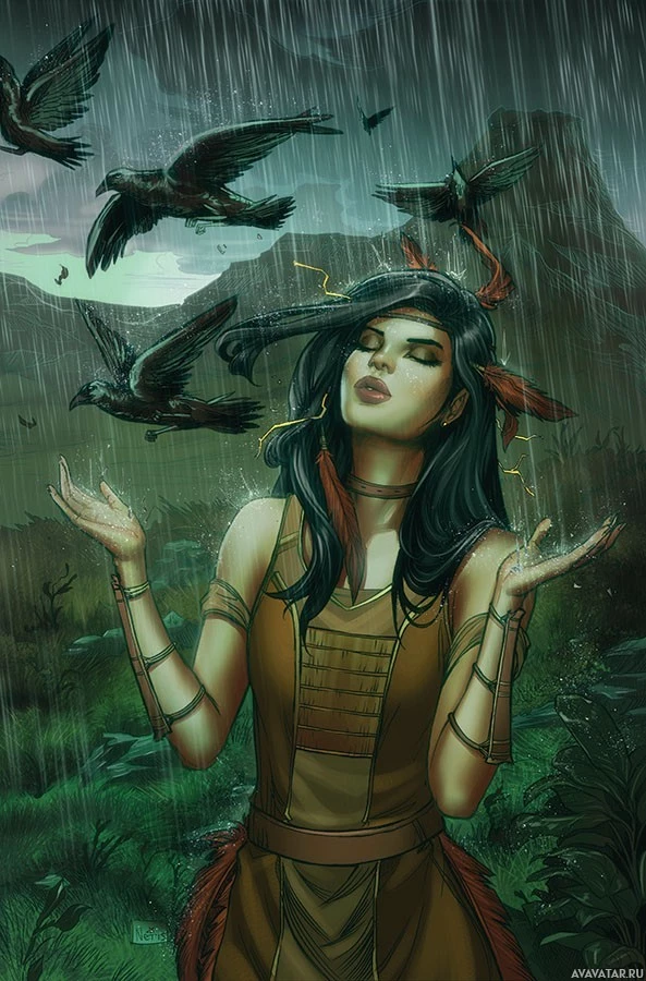 dark hair, a contemplative expression, and is holding her hands up towards the sky where birds are flying about. It seems to be raining, as evidenced by the falling