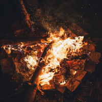 The image shows a bonfire with flames consuming wood. It appears to be an outdoor setting at night, as indicated by the darkness in the background and the warm glow of the firelight. There's a sense of coziness and perhaps a gathering or event associated with this fire.