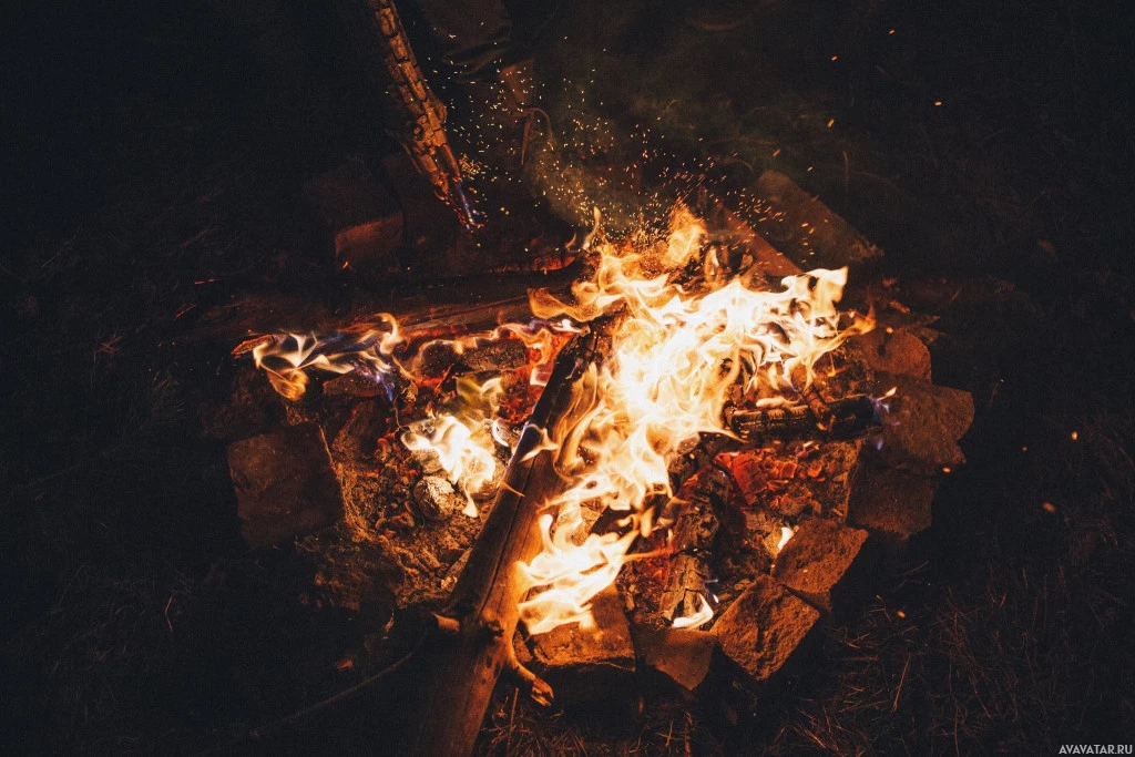 На картинке изображен костер с пламенем, поглощающим древесину. По-видимому, это наружная обстановка ночью, о чем свидетельствует темнота на заднем плане и теплое свечение огня. Есть чувство уюта и, возможно, собрание или событие, связанное с этим огнем.