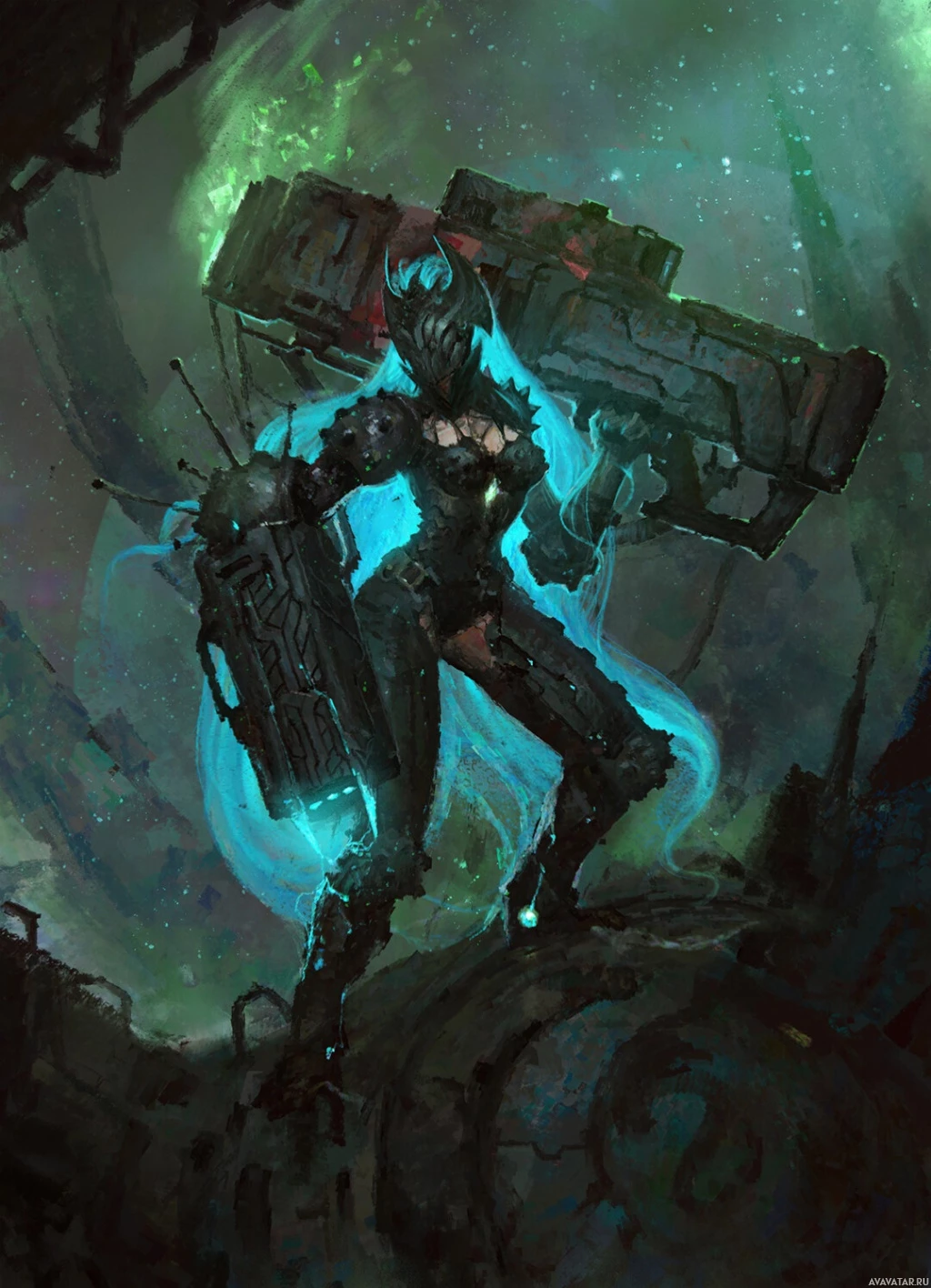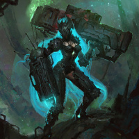 the video game series "Destiny" by Bungie. This is a piece of artwork that portrays the character as having mechanical or robotic parts, with a glowing
