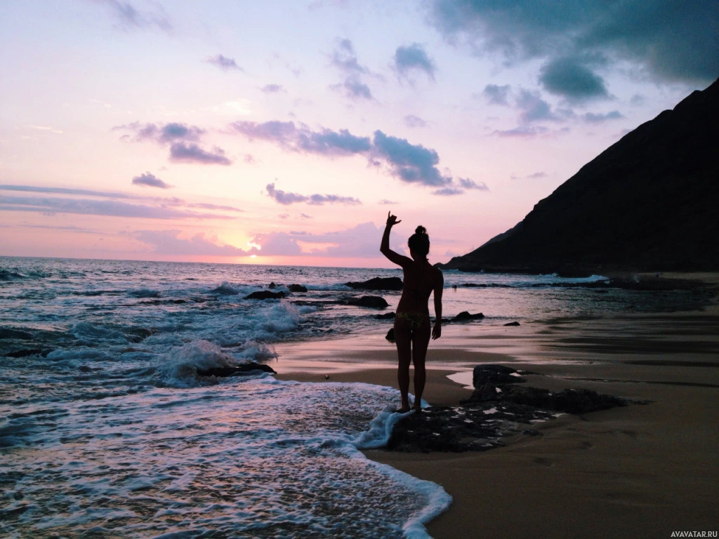 a silhouette of a person standing at the beach during what appears to be either sunrise or sunset, given the colors in the sky. The individual is facing away from the camera, with their arms raised towards the sky as if they are celebrating or expressing joy. In the background, there's a view of the sea and a distant