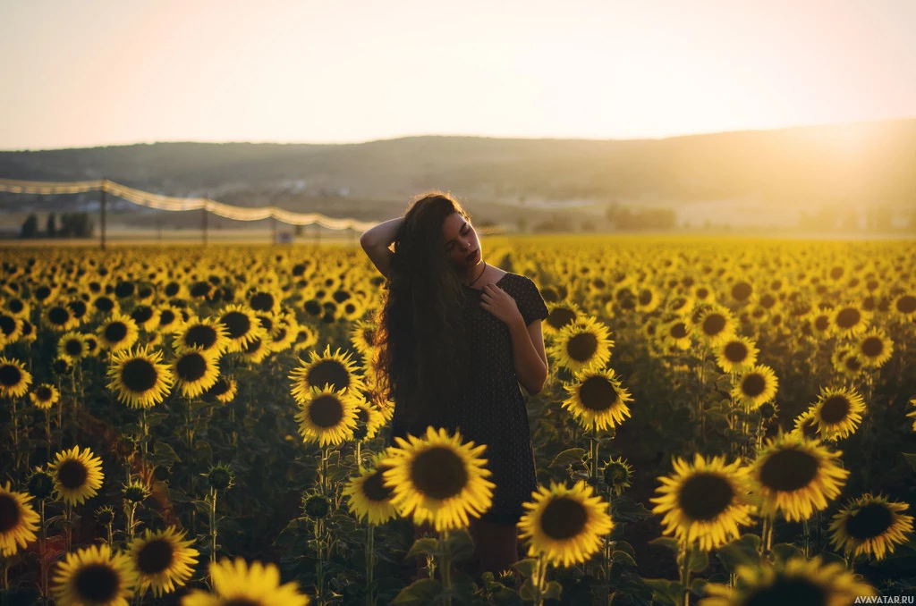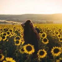 The image depicts a person standing in a field filled with sunflowers. The individual appears to be looking down at the flowers, and there's