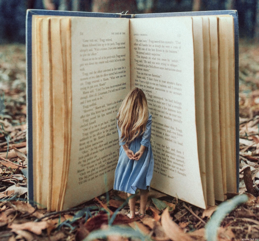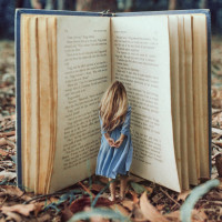 a young girl from behind, peeking through the pages of an open book. She appears to be engaged in reading the storybook, which is placed on the ground surrounded by fallen leaves, suggesting a tranquil