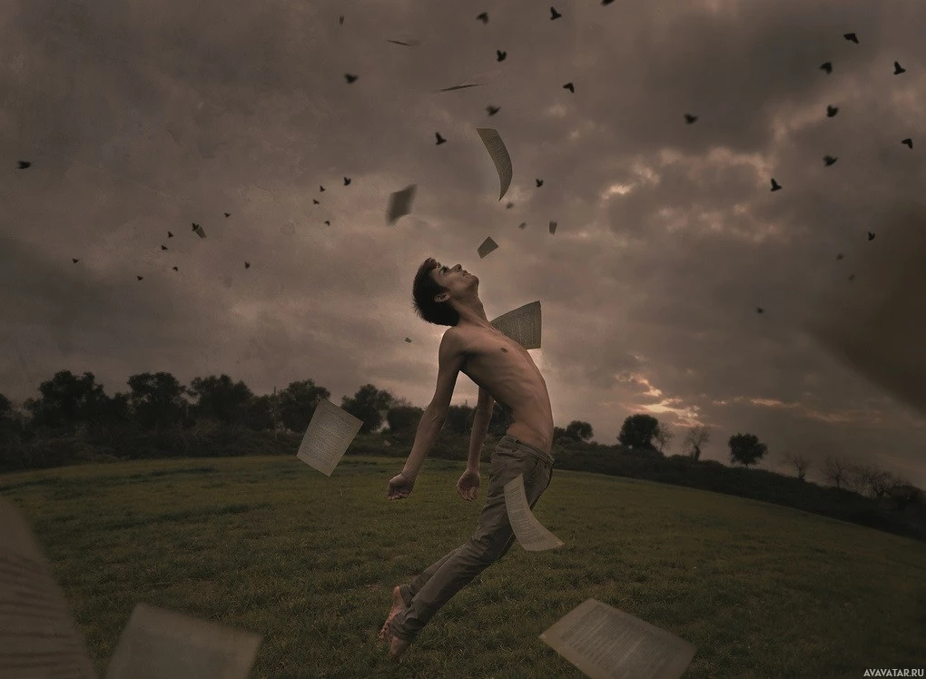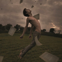 the flying papers. The person seems to be in motion, running or dancing among the falling