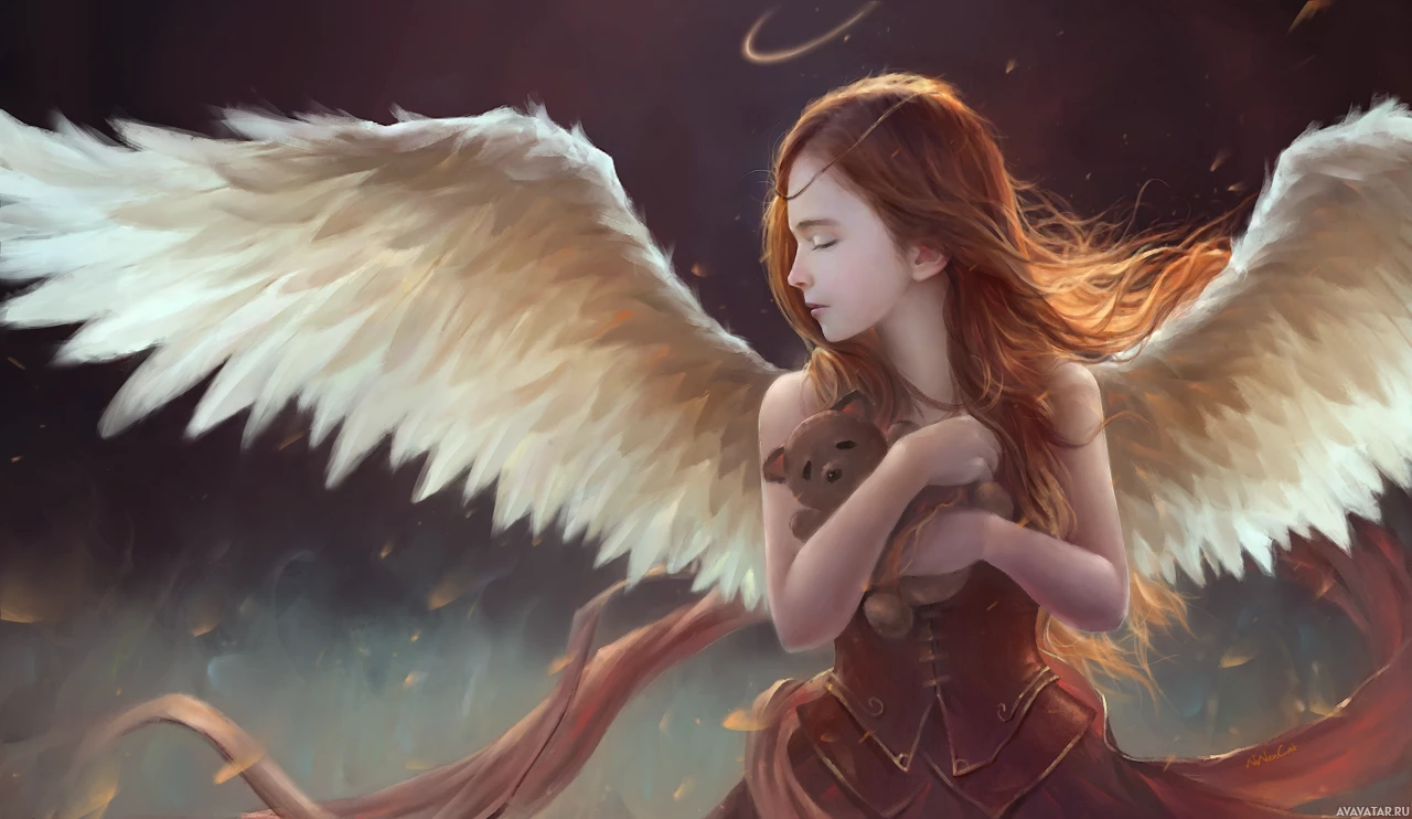 red hair, who appears to be an angelic figure with large wings. She is holding what looks like a doll or small animal in her arms and has
