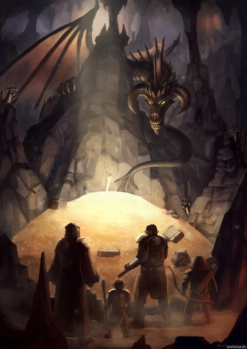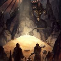 a fantasy scene featuring a group of adventurers or knights gathered around an entrance to a cave. Inside the cave, a dragon can be seen with its wings spread wide, appearing as if it's guarding the entrance. The lighting and shadows suggest a dimly