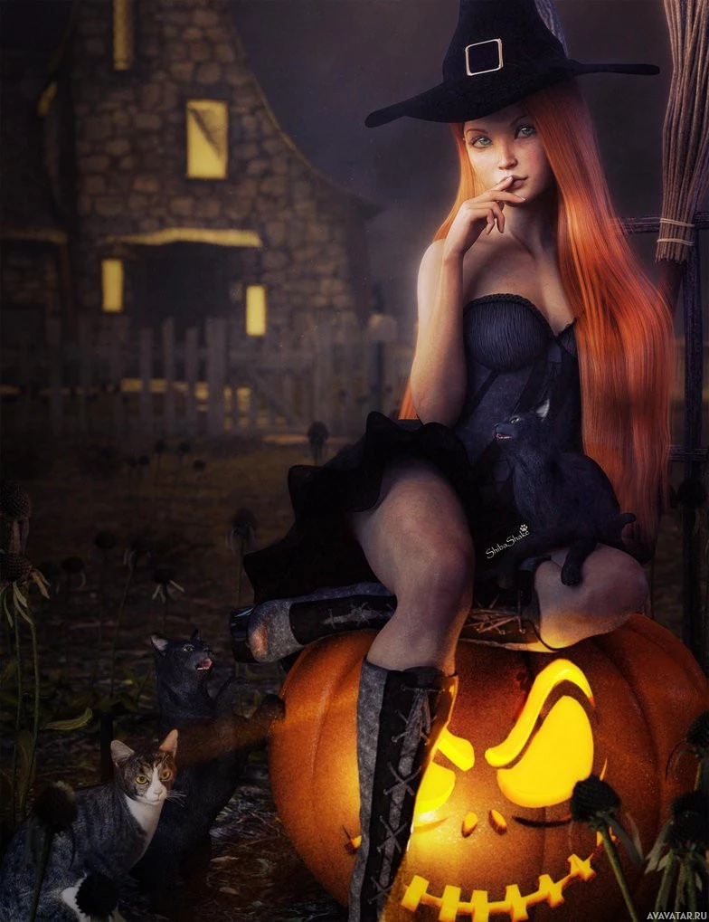red hair wearing a pointy hat. She is sitting on a pumpkin that has carved faces on it, which are typical for