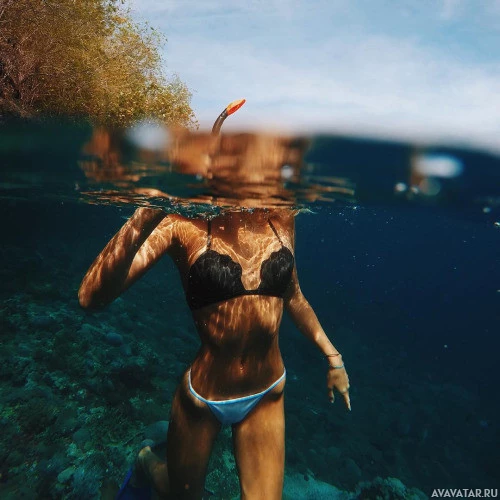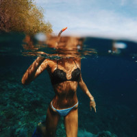 bikini top and a white bottom, which suggests she might be swimming or scuba diving in the ocean. Her face is not visible as it is partially covered by the water, which adds an interesting visual element to the photo. The