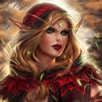a female character with elven features, resembling an Elf from fantasy or game-related contexts such as World of Warcraft. She has pointed ears and is adorned with accessories that suggest she might be a warrior or