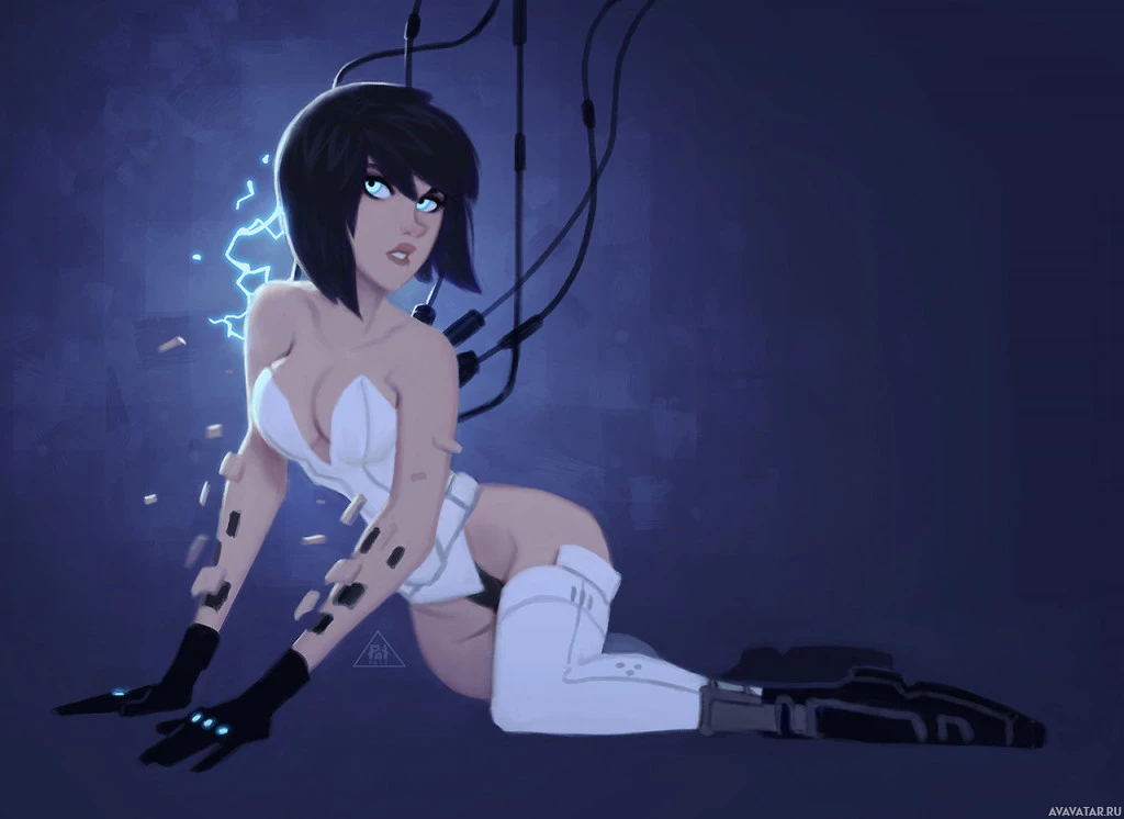 a female character with a brunette hairstyle. She appears to be wearing a white and black outfit that resembles a futuristic or cyberpunk style. There are visible wires or cables around her body, possibly indicating she has some sort of