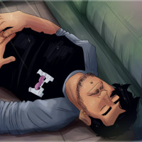 The image shows an illustration of a man lying on his back, seemingly asleep. He appears to be relaxed and at ease. His attire suggests casual wear, and he has