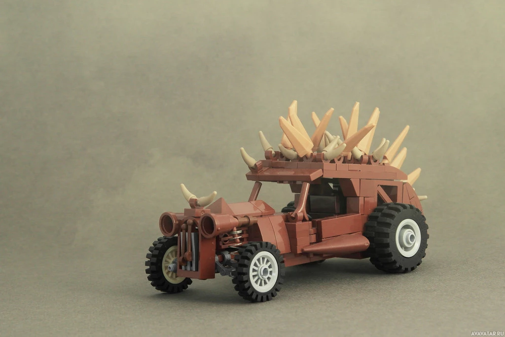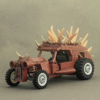 exhaust pipes and what looks like additional attachments on the top of the vehicle. The design is quite intricate and captures the essence of an adventurous or exploratory vehicle.