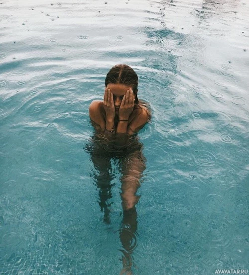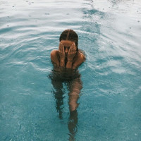 a swimming pool. The individual appears to be facing away from the camera with their back towards it, and they are covering their eyes with both hands. The water around them looks calm, and their hair seems wet, indicating that they might have recently been submerged.