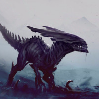 The image shows a fantasy creature that resembles a hybrid of a dinosaur and an alien, commonly known as the "Xenomorph." It's a fictional depiction with exaggerated features typical of fantasy artwork. The creature has sharp teeth and claws, and its skin is textured to give it a menacing appearance. The background suggests a desolate or otherworldly environment, possibly in a scene from a science fiction story or movie.