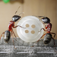 The image shows two ants engaging in what appears to be a playful or aggressive interaction with each other. One ant is standing upright and facing the other, while the other seems to be holding onto the first ant's antennae, which could suggest a form of communication or even a fight between them. There are also several tools scattered around, including scissors and pins, suggesting that this scene might have been set up in a human-made environment, perhaps for