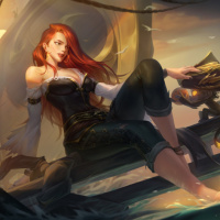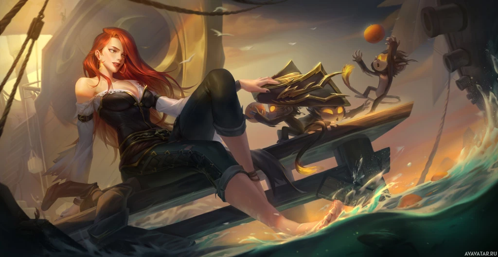 red hair. She is styled in a fantasy-themed outfit, possibly resembling that of a pirate or adventurer from
