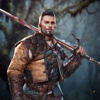 a monster hunter in a fictional medieval world. In this particular image, the character is depicted with a rugged appearance, wearing armor and carrying a sword. The setting appears to be a forest or