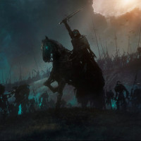 a dramatic scene from what appears to be a fantasy-themed game or media. In the foreground, there is