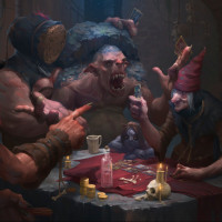 a playing card, while another seems to be shuffling a deck. The setting has a rustic feel, with