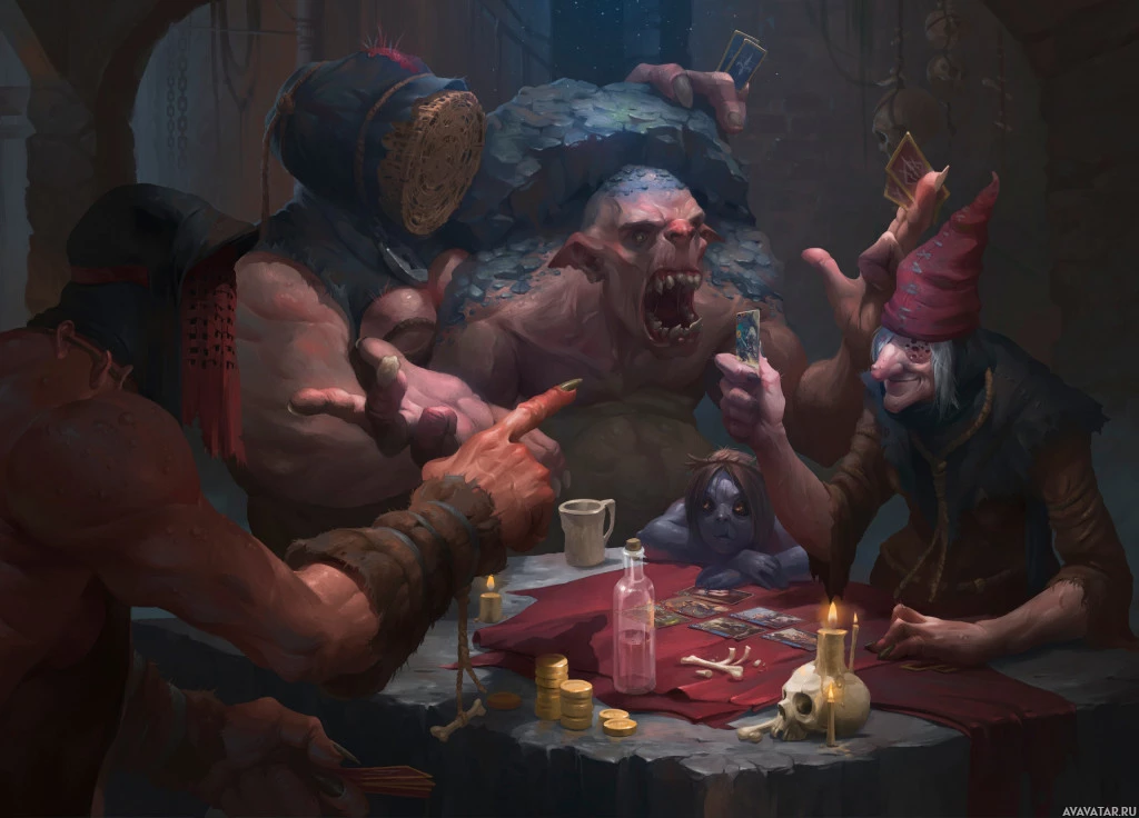 the macabre atmosphere. This scene is reminiscent of a moment from "The Witcher 3: Wild Hunt," where characters are enjoying a card game in a tavern or similar setting.