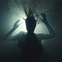 The image shows a silhouette of a person submerged in water, likely a swimming pool. The figure is reaching towards the surface with arms outstretched, creating an impression of motion and struggle against gravity or resistance while trying to reach the top of the water. The use of black and white adds a dramatic effect to the image, focusing attention on the silhouette and the action taking place.