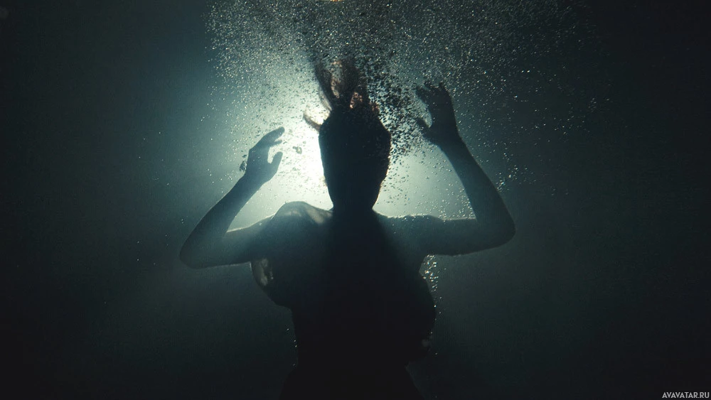 На картинке изображен силуэт человека, погруженного в воду, вероятно, бассейн. Фигура тянется к поверхности с вытянутыми руками, создавая впечатление движения и борьбы с гравитацией или сопротивлением при попытке достичь вершины воды. Использование черного и белого добавляет драматического эффекта изображению, фокусируя внимание на силуэте и происходящем действии.