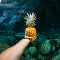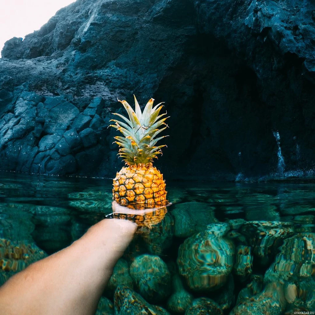 The image shows a person submerged in water up to their neck, holding a pineapple. The background reveals underwater rock formations and reflections of