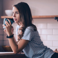 The image shows a woman in what appears to be a kitchen setting, leaning on a counter with her elbow. She's holding a cup of coffee or tea, and she seems to be looking off to the side with a thoughtful expression. Her posture and facial features suggest she might be deep in thought or enjoying a quiet moment.