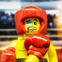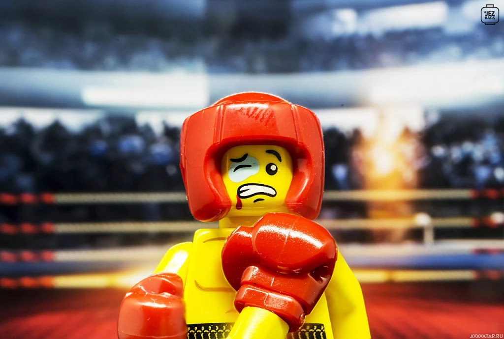 The image features a Lego figure boxer in the ring, likely representing a scene from