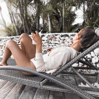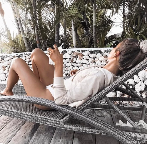 На картинке изображена женщина, лежащая на спине, в белом прикрытии или халате. Она расслабляется и, возможно, наслаждается солнцем. На заднем плане есть пальмы, что говорит о том, что она находится в тропической обстановке, возможно, на пляжном курорте. Это цветная фотография с яркой зеленью и блюзом из окружающей растительности.