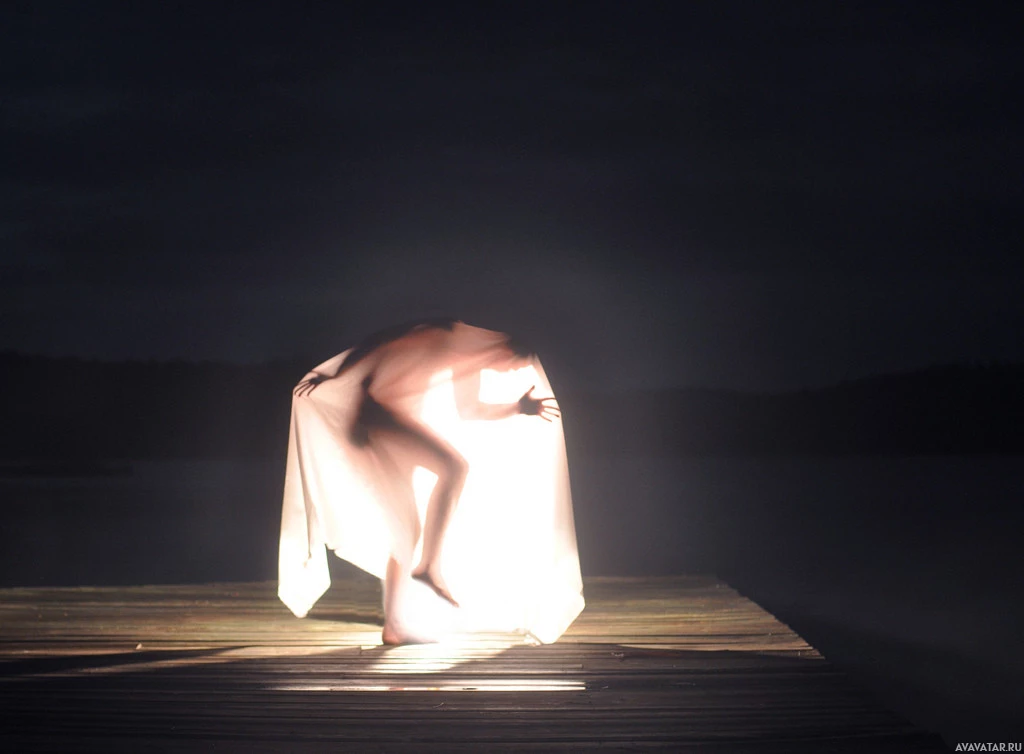 a dock at night. There is a silhouette effect where the individual's form and clothing are not clearly visible, emphasizing the darkness of the setting against a lighter background that could be the sky or clouds illuminated by