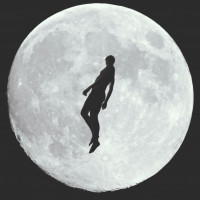 The image features a silhouette of a person on the moon, as seen from Earth. This is an artistic representation and not an actual photograph of a real event. The silhouette is depicted jumping or floating in the air with one leg extended towards the ground, against the backdrop of the full moon in the sky.