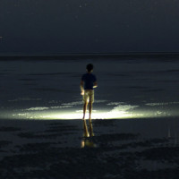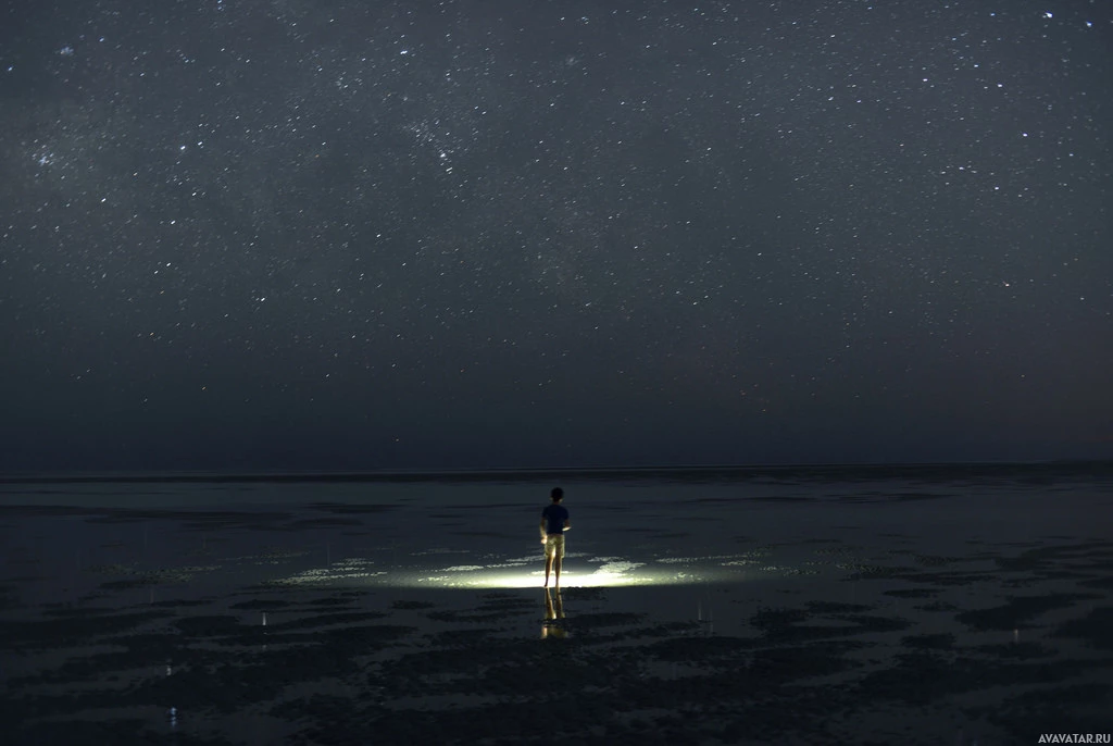 calm water reflecting the starlight and the person's flashlight. The overall atmosphere is serene and somewhat eerie due to the darkness and