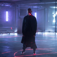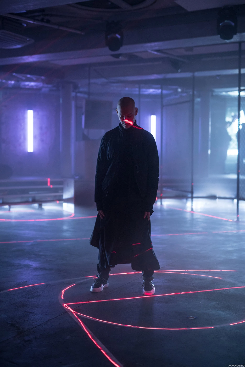 an indoor space with a futuristic or high-tech ambiance. The individual is dressed in long, flowing garments that could suggest a costume or stylistic choice for the photograph. They are positioned with one foot on a red line, which creates a striking contrast against their black attire and the gray