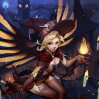 glowing candles in the background, which could be indicative of a Halloween or nighttime theme associated with her character. Her pose and expression convey confidence and readiness for action.