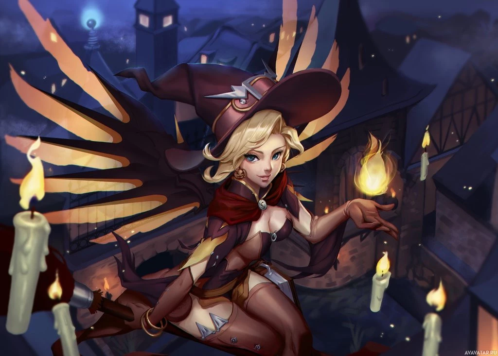the video game Overwatch. This character is known as Mercy, and she is often referred to as an angel or healer due to her abilities in-game. She is wearing traditional witch attire, including