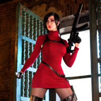 In the picture, there is a woman standing confidently. She appears to be dressed as Ada Wong from the Resident Evil