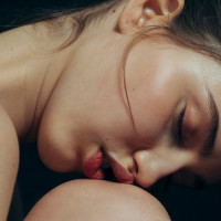 The image features a person with their eyes closed and what appears to be a contemplative or peaceful expression. The individual is looking down, which might suggest introspection or relaxation. The focus on the person's face and