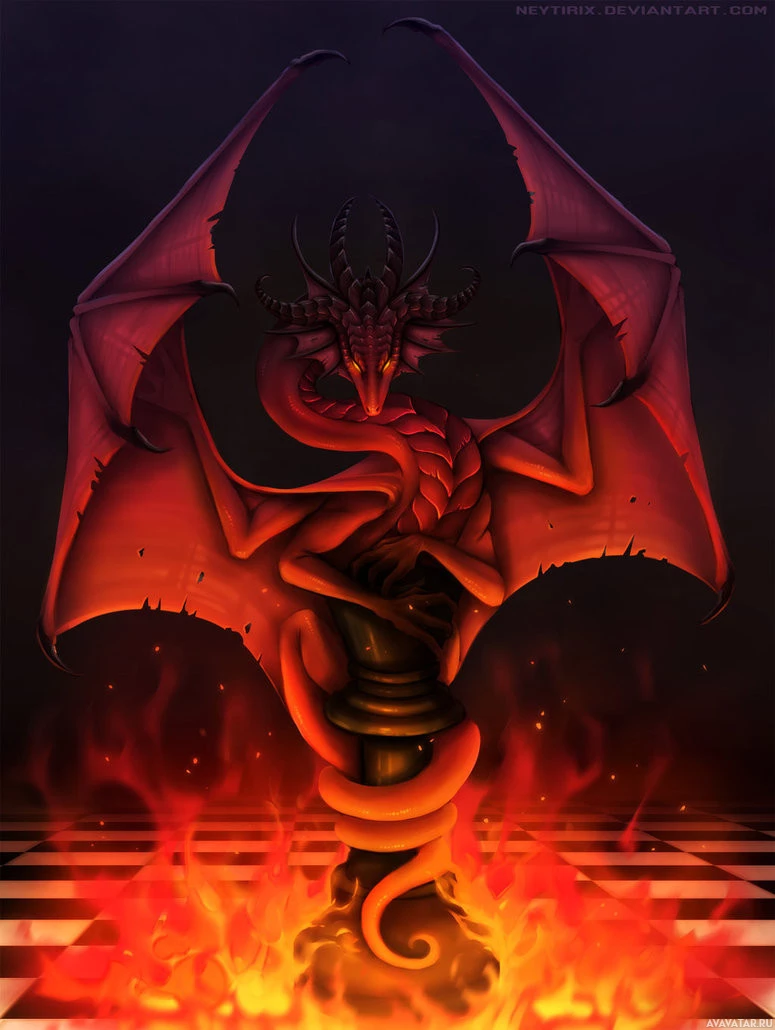 a mythical creature often found in fantasy literature and games. The dragon is surrounded by flames that resemble a chessboard pattern, which adds to the overall