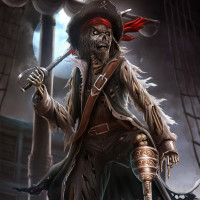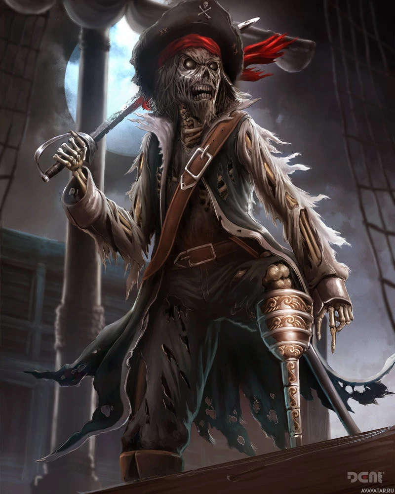 pirate attire, complete with a hat and sash across the chest, but the skin is pale and there are visible signs of decay such as missing flesh or darkened bones. In one hand, they hold what looks like